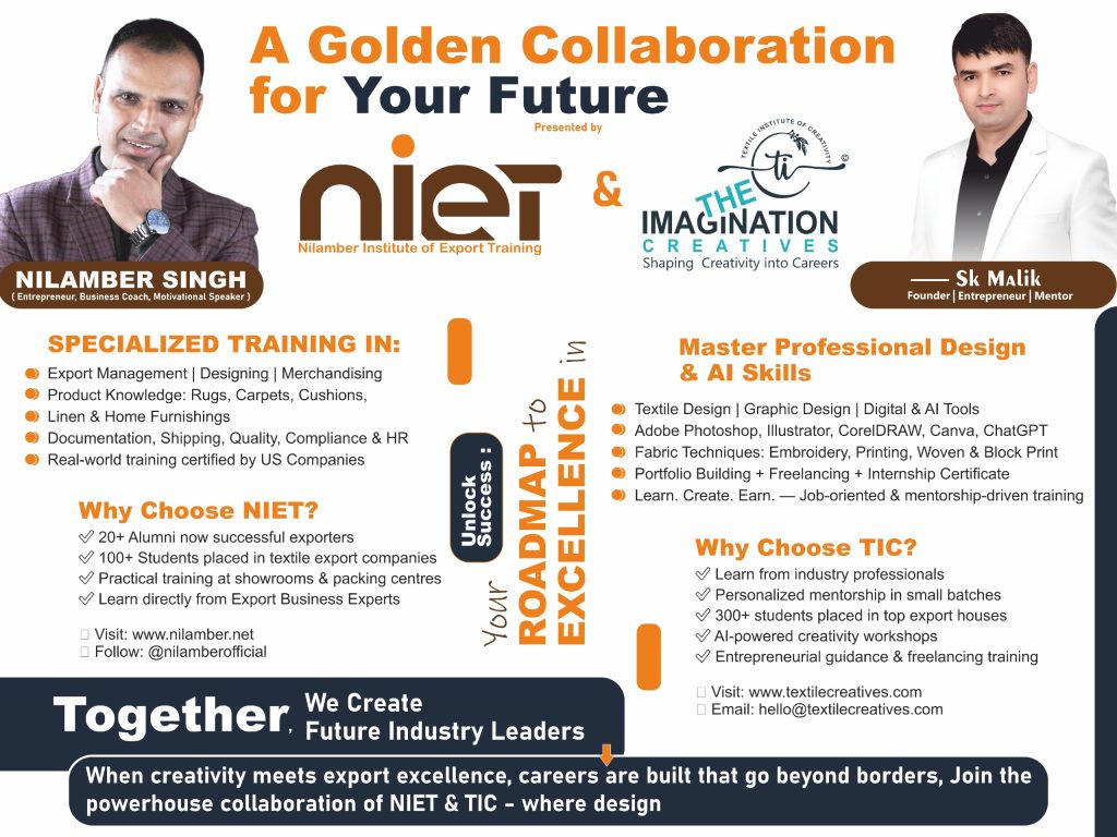 NIET(Nilamber Institute of Export Traning) is a vocational training institute through which people are given information about textile exports and how to improve their business and job profile.